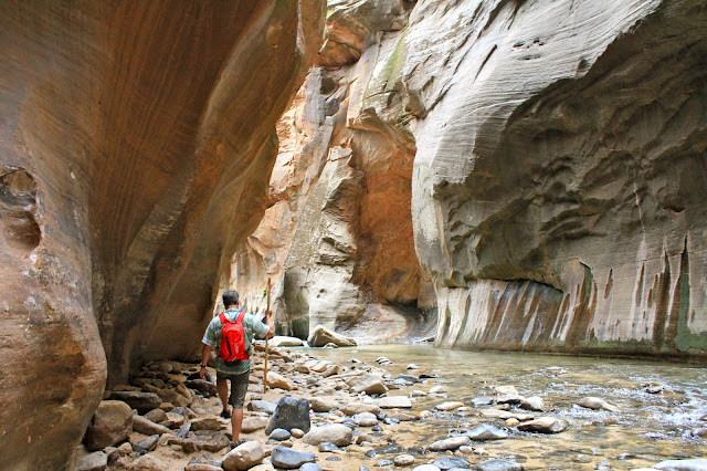 When you say you are hiking The Narrows, you are essentially saying you are hiking the Virgin River. If you aren't staying overnight, you just take the mile long Riverside Walk hike at the end of the bus line at Zion National Park and then jump in the river and start walking! You can go up about 5 miles without a permit before you have to turn back, but I think we just went over 2 miles up (about 5 total plus the Riverside Walk hike). It's pretty slow going since you are doing a lot of bouldering and also going through the water, but it's absolutely breathtaking, so going slow isn't a problem.